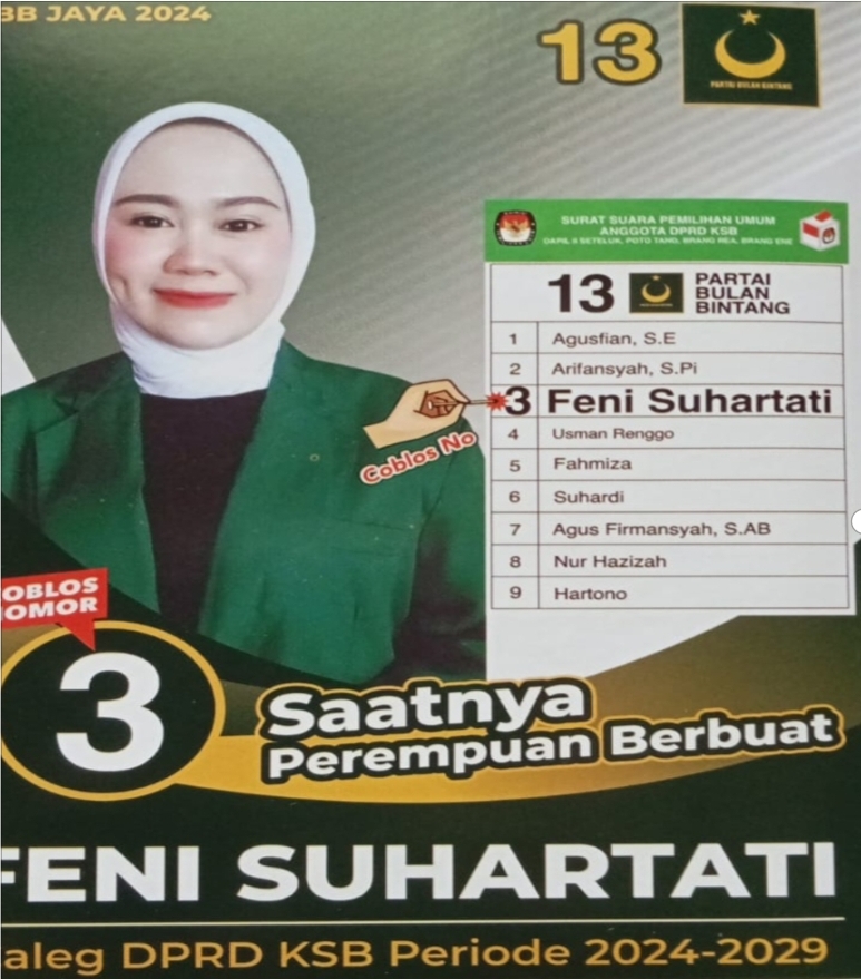 “Muncul Caleg perempuan dari PBB yang lagi ramai disebut sebut, berdomisili di Seteluk, memiliki basis keluarga besar, cukup punya nama,” cetus salah seorang Caleg, partai lain, berbicara di Poto Tano, siang tadi.