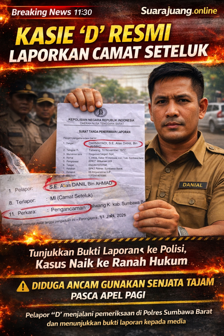 Sumbawa Barat, NTB – Suarajuang.online | Insiden memanas antara Camat Seteluk berinisial “MI” dan salah satu kepala seksi (Kasie) berinisial “D” kini berbuntut panjang. Kasie “D” secara resmi melaporkan Camat “MI” ke pihak kepolisian dengan dugaan ancaman menggunakan senjata tajam.